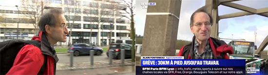 經(jīng)過諸多媒體的報(bào)道后,就有記者找到阿蘭·馮特諾,經(jīng)采訪得知他家住伊夫林省拉韋里耶爾鎮(zhèn)。在公交系統(tǒng)罷工已經(jīng)持續(xù)多日的情況下,與很多大巴黎地區(qū)的居民一樣,他下班返家面臨極大困難。上班時(shí),他通常每天早上6點(diǎn)半開始以分時(shí)段的方式工作,有時(shí)下班時(shí)間是晚上8點(diǎn)。罷工開始后,他與公司協(xié)商后將上班時(shí)間提前至早上6時(shí),這樣他每天就可以從家中乘坐一趟夜班車進(jìn)城。至于下班后通勤就變得異常棘手了。而他只有兩種選擇,第一種就是步行至巴黎蒙巴納斯火車站乘坐遠(yuǎn)郊鐵路N線或U線。但罷工期間,這些線路只在下午4點(diǎn)半后才開始恢復(fù)運(yùn)行;而第二種選擇就是全程步行回家,距離是30公里。徒步需然后先后穿行圣西爾、圣康丹、特拉普等市鎮(zhèn),然后才回到拉韋里耶爾鎮(zhèn)的家中。